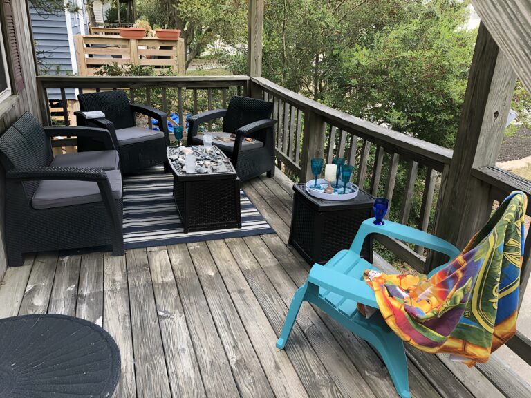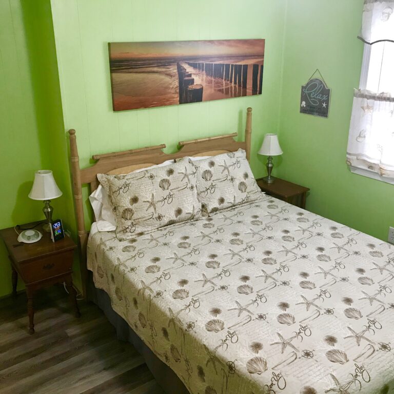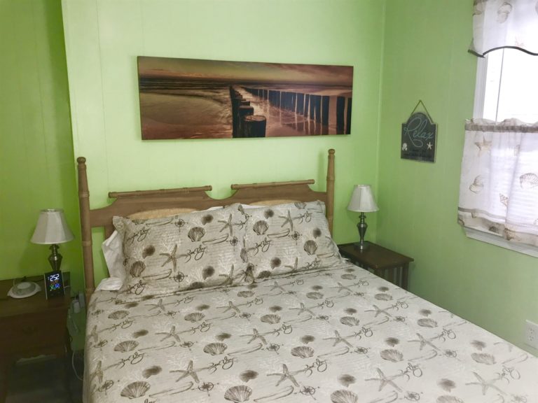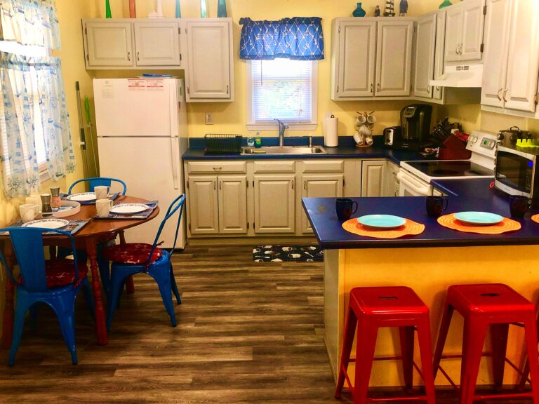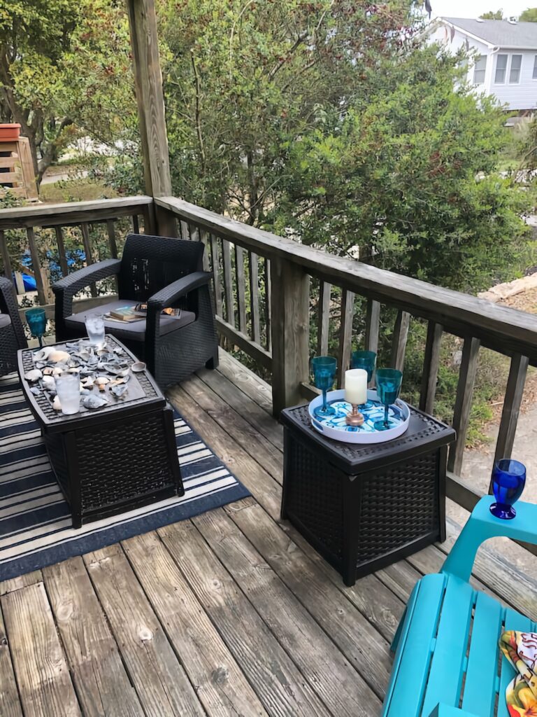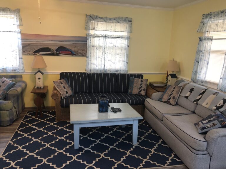 | · Baking dishes · Bathrooms: 1 · Bedrooms: 2 (Queen, Queen, full sofabed) · Beach chairs: (4, 2 different styles) · Central A/C and heating · Ceiling fans · Coffee maker (Keurig with single cup and Carafe capabilities) · Reusable single and Carafe-sized K-Cups for the Keurig. · Cookware · Cutting boards · Deck, main and upper (rooftop) deck · Dishes, plates, mugs and glasses (upper cabinet to the left of the stove) · French Press for coffee (above stove) · Front porch seating | · Hair dryer (ionic, under sink in bathroom) · 47” Smart TV in the living room · Iron & ironing board (located in the closet in the green “Seashell” bedroom) · Kitchen Towels · Knives · Linen rental and beds made for your arrival · Local guides/maps (in the far right top drawer in the kitchen) · Microwave · Oven and stove · Parking for multiple vehicles w/7’ clearance under the home · Parking pass for deeded beach access parking next to Avalon Pier and at the boat access at Dock Street and Bay Drive | · Pots and pans – non-stick and stainless steel · Refrigerator/freezer · Silverware and cooking utensils · Sleeper sofa (full) · Sound machines in bedrooms · Spices and herbs · Starter supplies with toilet tissue, a roll of paper towels, dish detergent, and a new sponge · Toaster (in cabinet above the stove) · Towels (please place soiled towels in the tub before leaving) · Towel hooks on the back of the bathroom door and both bedroom doors · Walking trail/multi use path nearby · Washer/dryer · Wireless Internet |