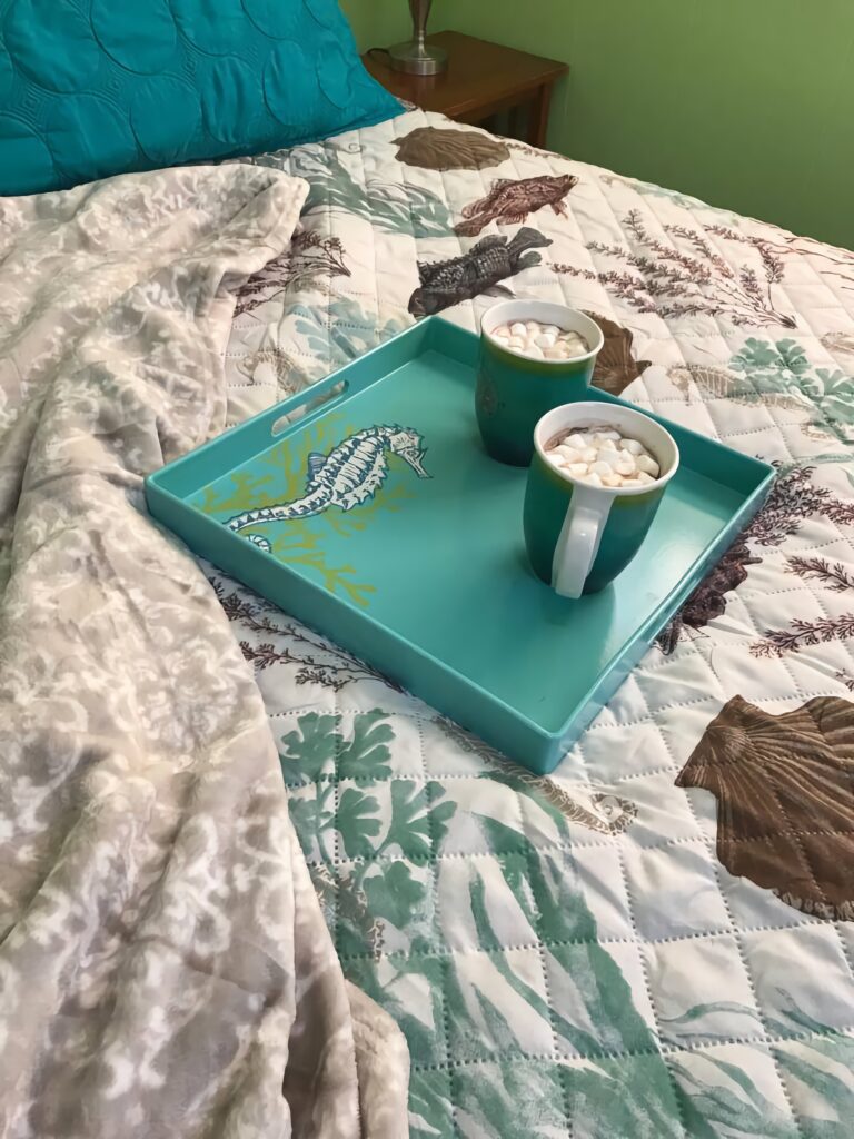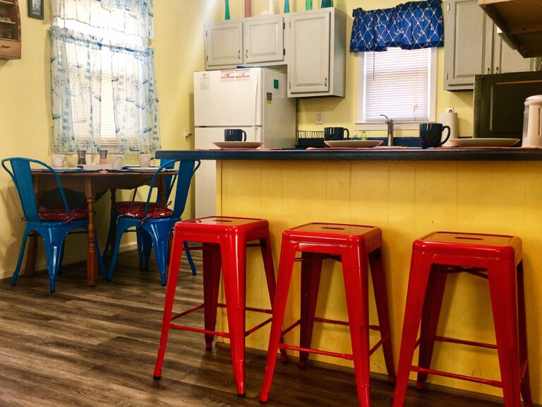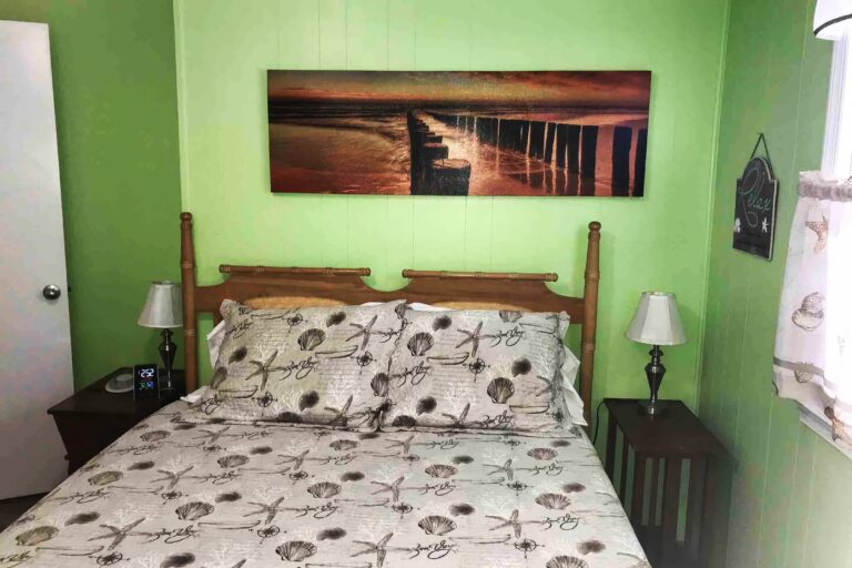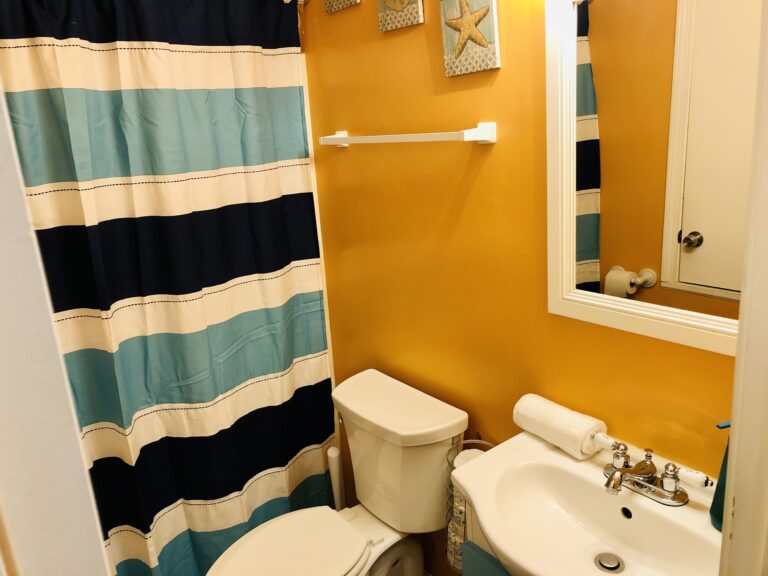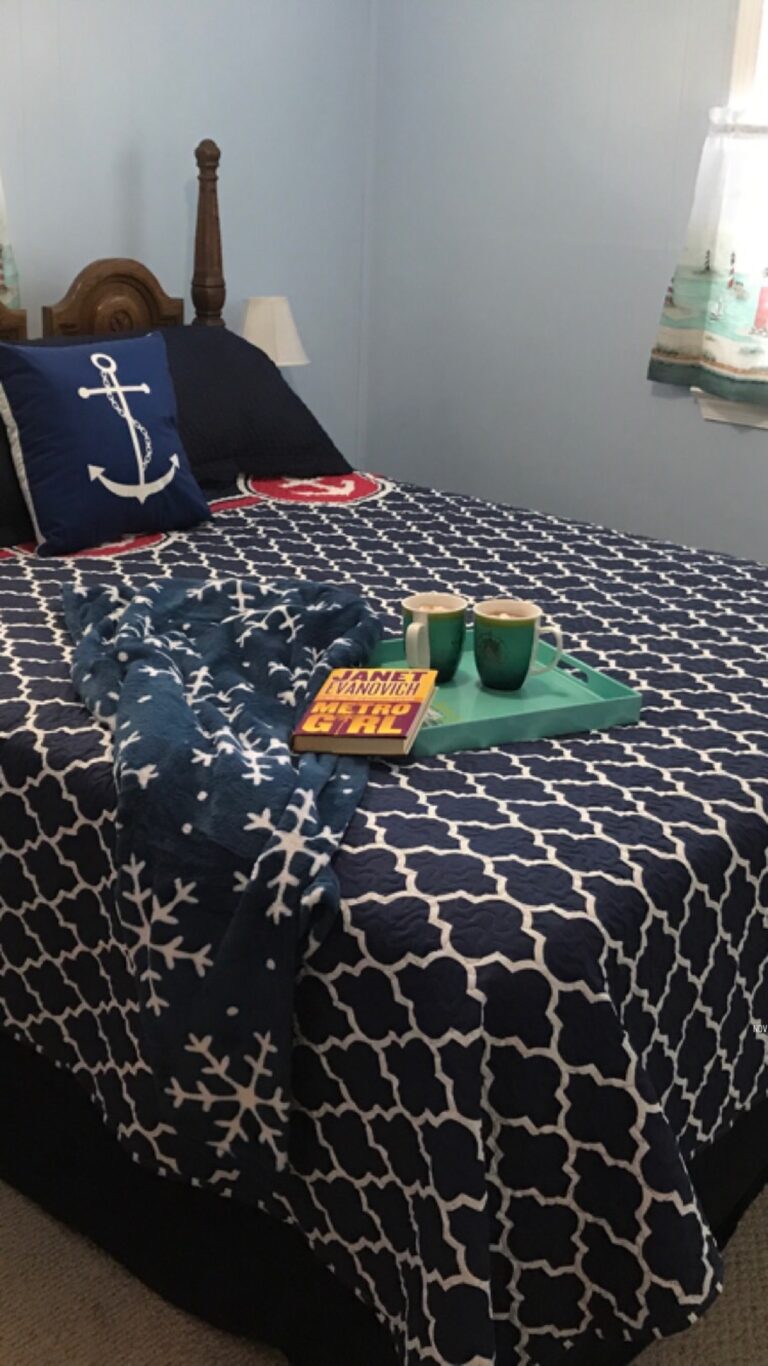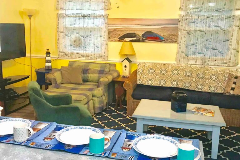| · Baking dishes · Bathrooms: 1 · Bedrooms: 2 (Queen, Queen, full sofabed) · Beach chairs: (4, 2 different styles) · Central A/C and heating · Ceiling fans · Coffee maker (Keurig with single cup and Carafe capabilities) · Reusable single and Carafe-sized K-Cups for the Keurig. · Cookware · Cutting boards · Deck, main and upper (rooftop) deck · Dishes, plates, mugs and glasses (upper cabinet to the left of the stove) · French Press for coffee (above stove) · Front porch seating | · Hair dryer (ionic, under sink in bathroom) · 47” Smart TV in the living room · Iron & ironing board (located in the closet in the green “Seashell” bedroom) · Kitchen Towels · Knives · Linen rental and beds made for your arrival · Local guides/maps (in the far right top drawer in the kitchen) · Microwave · Oven and stove · Parking for multiple vehicles w/7’ clearance under the home · Parking pass for deeded beach access parking next to Avalon Pier and at the boat access at Dock Street and Bay Drive | · Pots and pans – non-stick and stainless steel · Refrigerator/freezer · Silverware and cooking utensils · Sleeper sofa (full) · Sound machines in bedrooms · Spices and herbs · Starter supplies with toilet tissue, a roll of paper towels, dish detergent, and a new sponge · Toaster (in cabinet above the stove) · Towels (please place soiled towels in the tub before leaving) · Towel hooks on the back of the bathroom door and both bedroom doors · Walking trail/multi use path nearby · Washer/dryer · Wireless Internet |